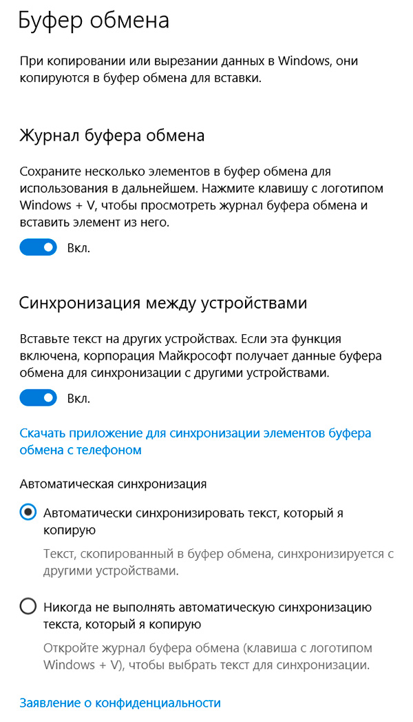 Кроме того, из него можно перейти в настройки и там задать синхронизацию буфера для каких-то других устройств - например, смартфонов на Android или iOS.