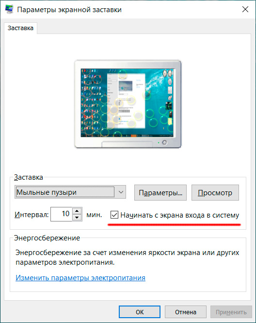 Первое - в параметрах заставки (Персонализация - Экран блокировки - Параметры заставки) нужно обязательно отметить опцию "Начинать с экрана входа в систему" - компьютер при этом будет блокироваться после включения экранной заставки.