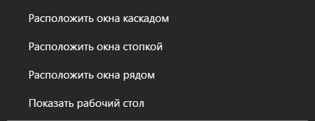 Ну и не забывайте о возможности расположить окна каскадом, стопкой или рядом с помощью пунктов меню, которое мы уже рассмотрели чуть выше, - правый клик мыши на свободном месте панели задач.