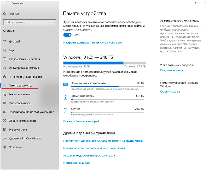Вызовите параметры системы с помощью Win+I, там выберите пункт "Память устройства".