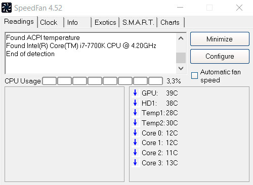 Температура при минимальных скоростях вращения (полная тишина) при работе с браузером, текстовым редактором и так далее.