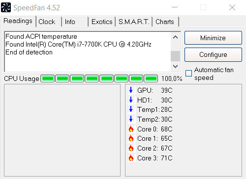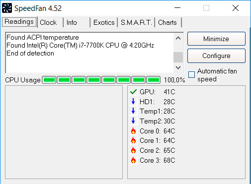 Температура при минимальных скоростях вращения (полная тишина), когда процессор загружен на 100% - идет перекодирование DVD в MKV с H.264.