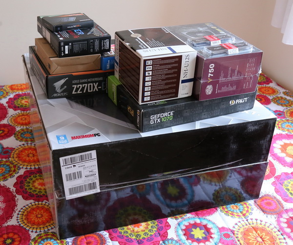 Вот подготовленный набор комплектующих (что это за комплектующие и почему я выбрал именно их - в статье "Собираю компьютер"). (Все фото - кликабельны, чтобы можно было рассмотреть всякие подробности.)
