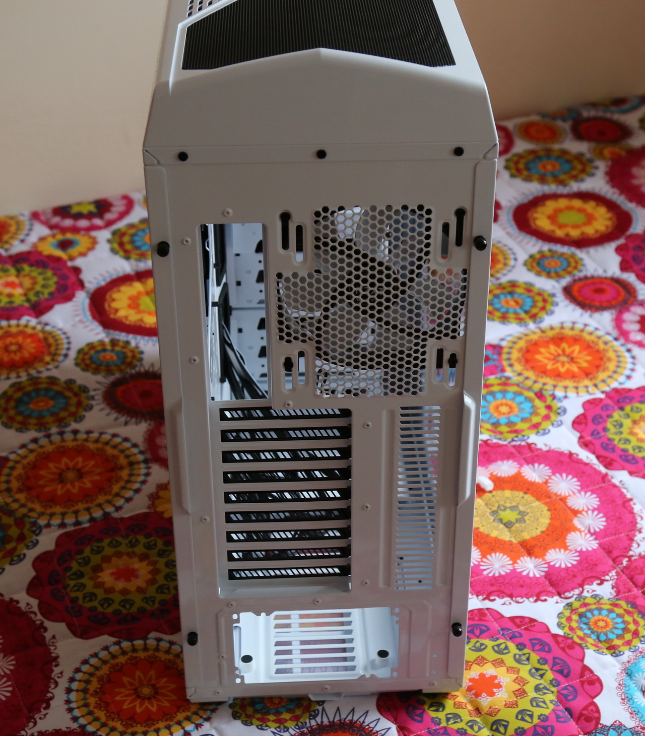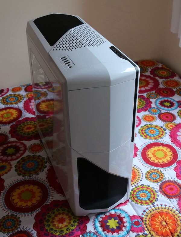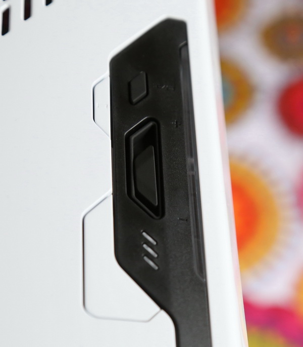 Справа - кнопка питания, кнопка перезагрузки, кнопка включения-выключения подсветки задней части корпуса, трехпозиционная кнопка переключения режимов обдува, индикатор работы жестких дисков, индикатор режима обдува.