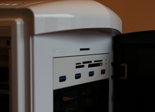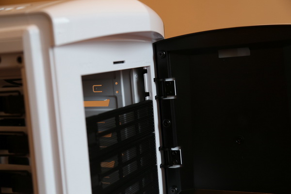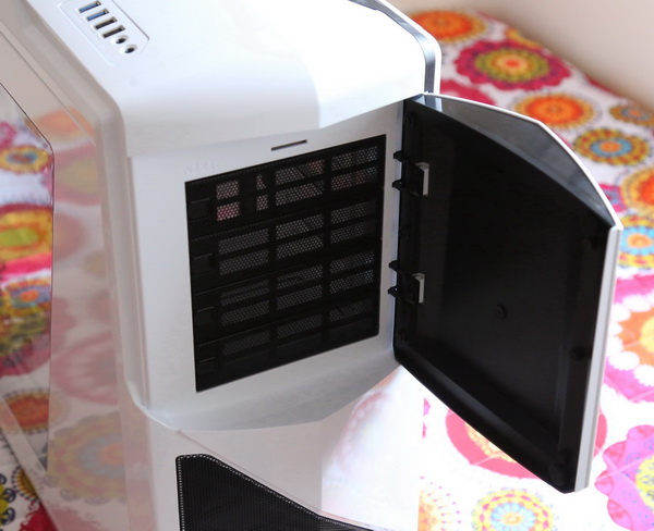 Передняя дверца открывается, под ней - четыре пятидюймовых посадочных места, например под DVD и всякие дополнительные панели.