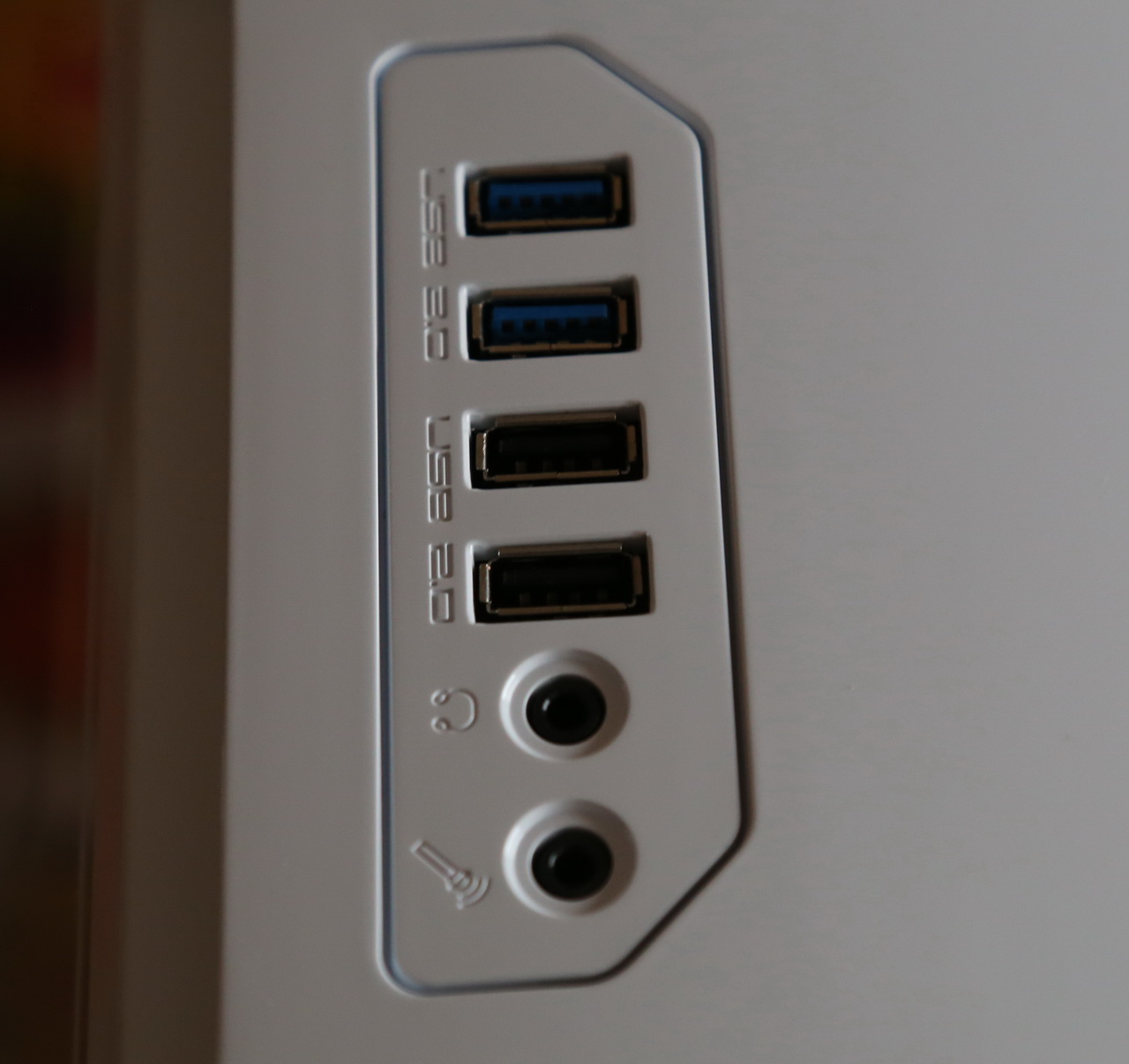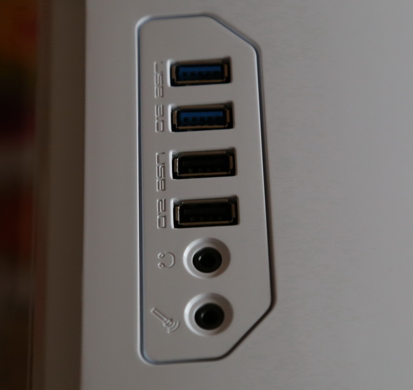 Слева на верхней крышке корпуса - два порта USB 3.0, два порта USB 2.0, выходы для подключения наушников и микрофона.