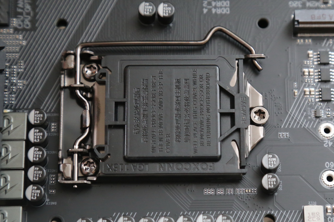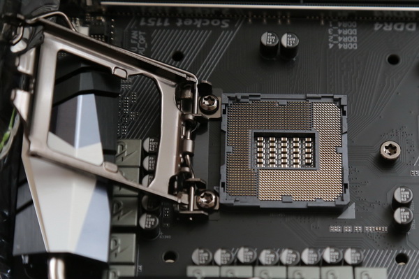 Слот для установки процессора. Освобождаем прижимную ручку, открываем прижимную рамку, снимаем пластиковую заглушку.