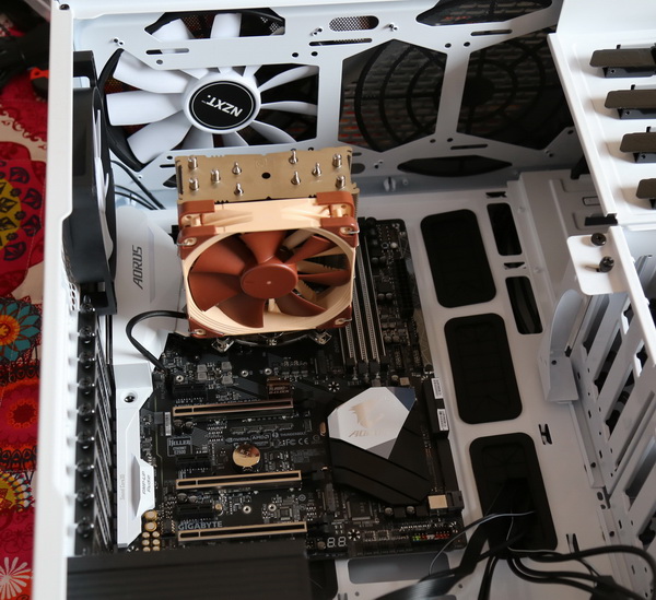 Но сначала одно замечание по поводу установки кулера. Он у меня установлен напротив корпусного вентилятора, подающего воздух внутрь корпуса. Однако лучше всего было бы развернуть радиатор с вентилятором на 90 градусов против часовой стрелки, чтобы он подавал нагретый воздух на вытяжной вентилятор, который установлен на заднем торце (оба этих вентилятора хорошо видны на фото). Но мне установить его таким образом мешало расположение на материнской плате слотов под карты памяти - в этом случае вентилятор упирался бы в карты памяти, что нежелательно. Поэтому я его установил именно так, как на фото, - так он ничему не мешает. И я подумал, что даже с таким расположением у меня не будет никаких проблем с охлаждением процессора: все-таки это очень эффективный кулер. (Сразу скажу, что так оно и оказалось - проблем не было.)