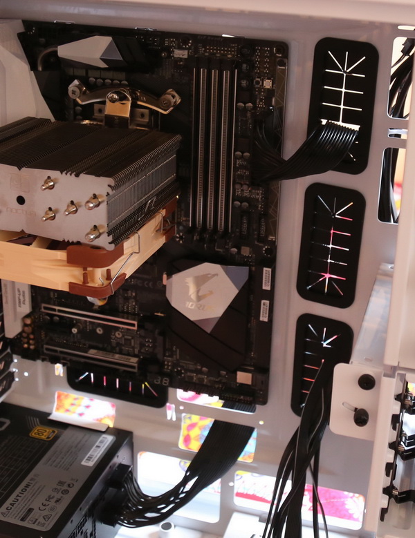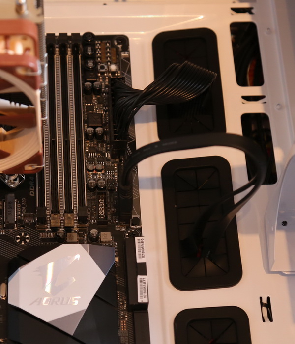 В современных корпусах всегда делаются специальные отверстия с резиновыми насадками, через которые кабели и провода можно прокладывать не сверху над материнской платой, а через заднюю стенку. Так и удобнее, и потом все выглядит намного аккуратнее.