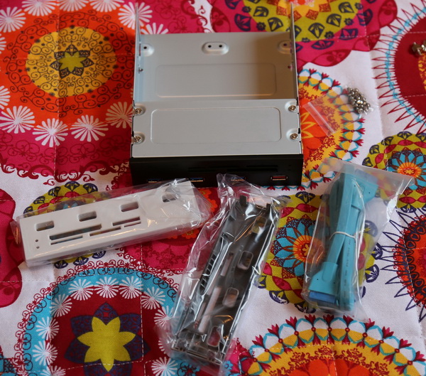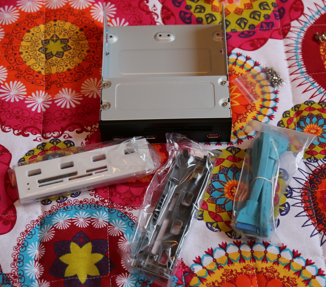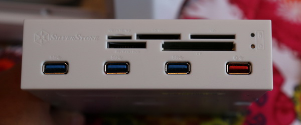 Для удобства работы я приобрел вот такой универсальный кардридер с дополнительными USB-портами. Он устанавливается в пятидюймовый слот корпуса.