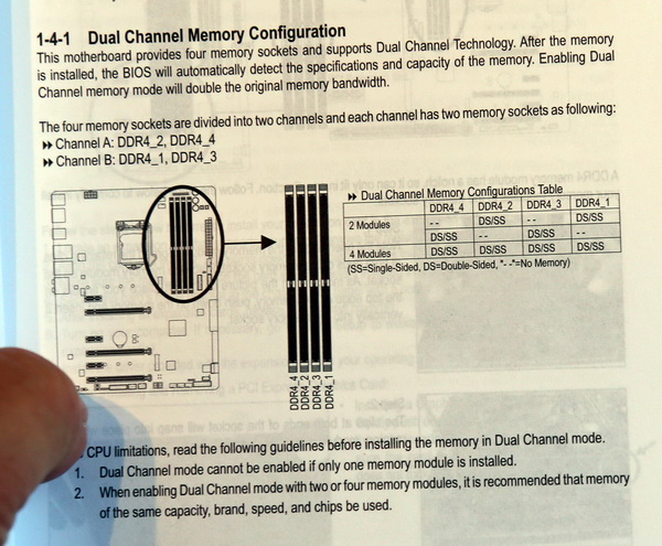 Теперь устанавливаем память. Перед этим надо на всякий случай посмотреть инструкцию: если используются только два слота из четырех (а у меня именно так), то пластинки памяти надо ставить через слот - это так называемая двухканальная конфигурация памяти. В инструкции четко написано, как эту память устанавливать: или в 1-й и 3-й слоты, или во 2-й и 4-й.