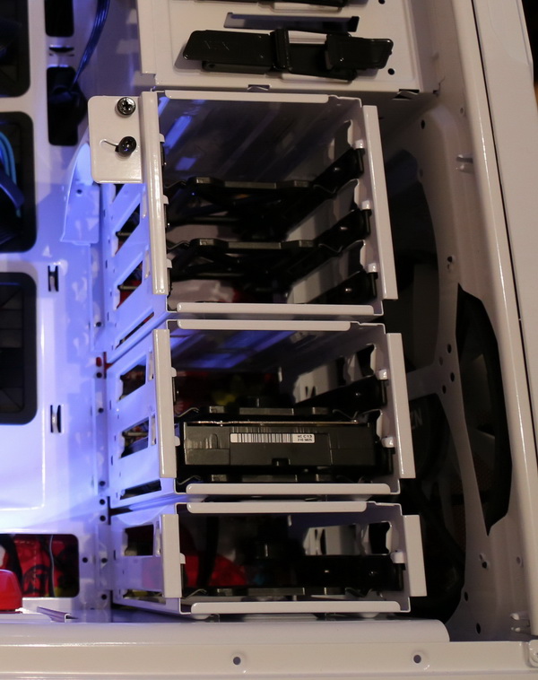 Диск ставится очень просто: из корзины для дисков вытаскиваются пластиковые держатели, железные держатели вставляются в крепежные отверстия жесткого диска, после чего диск вставляется в выбранный раздел корзины и защелкивается. Его колодки питания и интерфейса оказываются на задней стенке, там и подключаются кабелем питания и кабелем SATA.