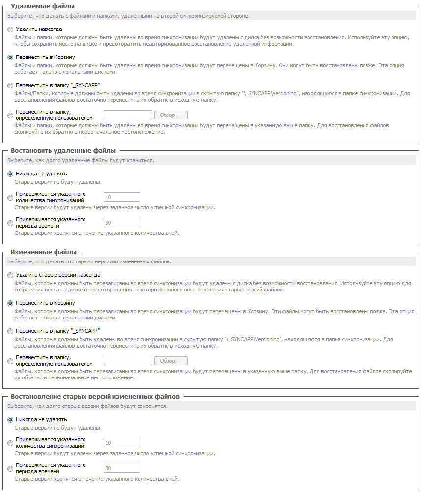 Чтобы не удалить что-нибудь очень нужное (мало ли, случайно убьете целую папку на ноутбуке, а программа при синхронизации убьет такую же на компьютере), вы можете настроить, как именно программа будет поступать с удаляемыми файлами. Например, она может хранить их в специальной папке.
