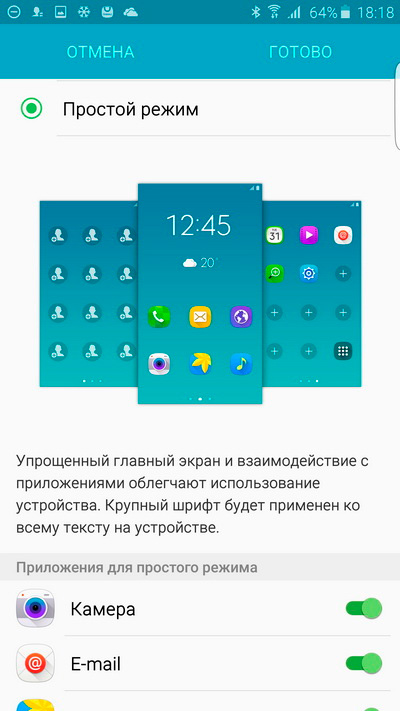 У Samsung это тоже называется "Простой режим": крупные пиктограммы, крупный шрифт, простая настраиваемая оболочка.
