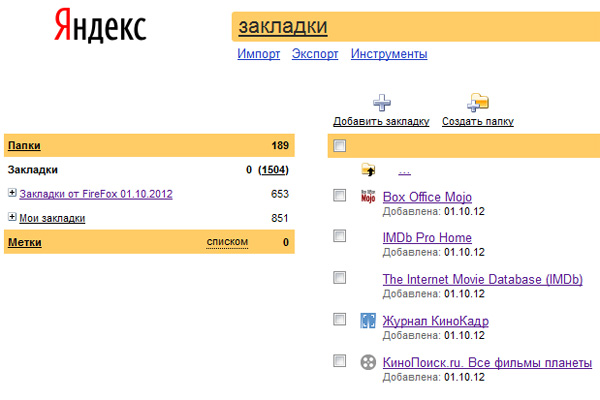 Сервис умеет делать импорт закладок из того же HTML-файла, так что после создания HTML-файла желательно скопировать закладки и на Яндекс. Тут плюс не только в том, что закладки теперь будут храниться в онлайне и вы их оттуда всегда сможете восстановить (через тот же экспорт закладок в HTML и последующий импорт в браузере), но и в том, что теперь вы сможете получить доступ ко всем вашим закладкам с любого компьютера, подключенного к Интернету.