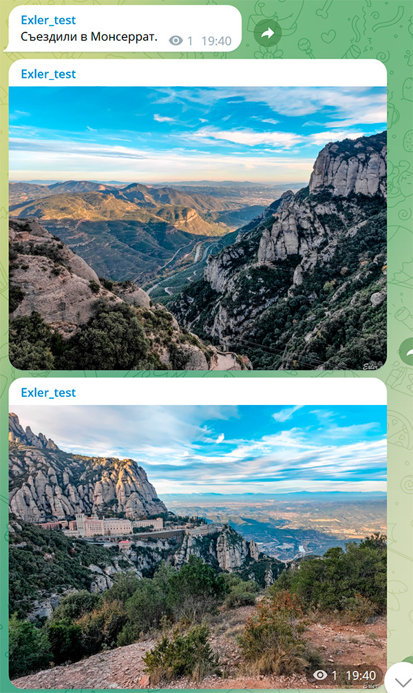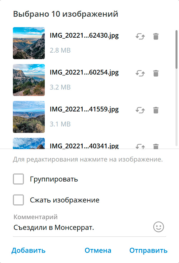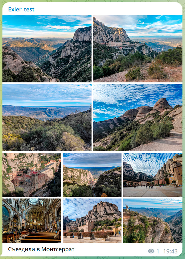 Если же выбрать "Группировать", то Telegram изображения сам сгруппирует в альбом превьюшек, приложенных к одному посту - и это, наверное, самый удобный вариант.