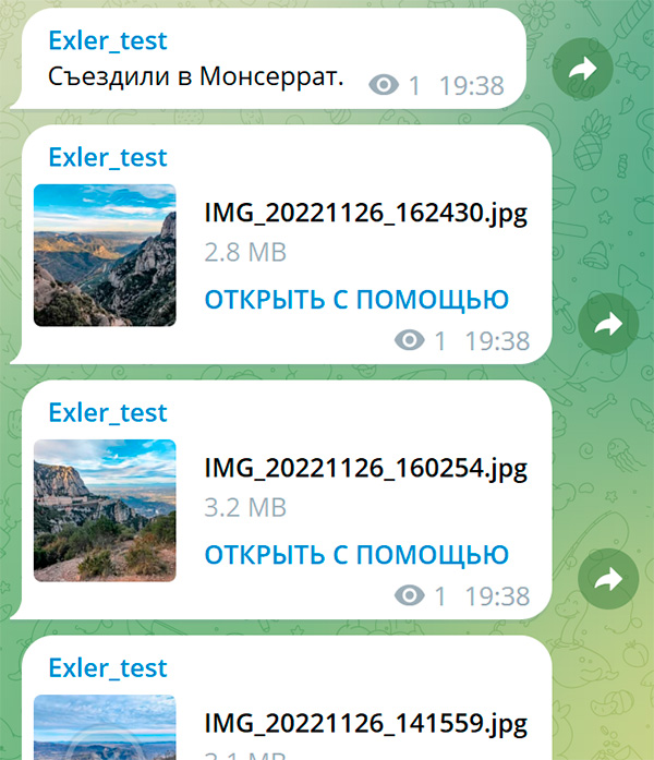 Если их не выбирать, то Telegram сначала опубликует подпись, а потом по одной - превьюшки изображений, каждую из которых можно будет открыть отдельно в нужной программе, выбрав ее из выпадающего списка.