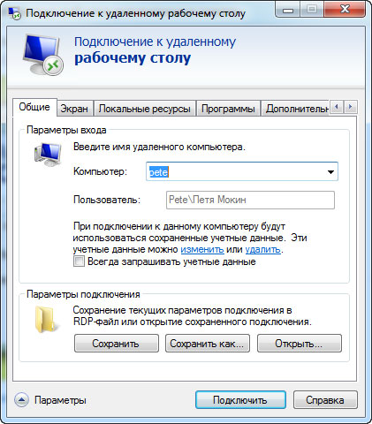 Нажимаете кнопку "Подключить", после чего, если компьютер будет найден и подключение возможно, у вас запросят пароль пользователя. Эти данные можно сохранить, чтобы в следующий раз подключаться без ввода пароля.