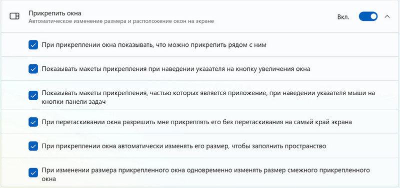 Здесь можно как отключить Snap Layout, так и включить-выключить определенные параметры работы этой системы.